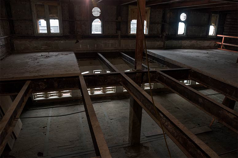 Neglect led to extensive water damage in just about every corner of the building, and rot and mold infiltrated its core—leaving the once-glamorous club saturated, warped, and in overall bad shape.