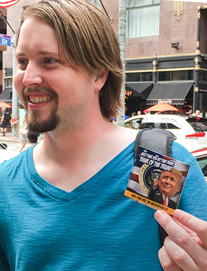 Nor was I the only one to find the whole shebang darkly amusing. Eric Yesbick, a stand-up comedian from Albany, Georgia, drove to Cleveland to be part of the madness. When we met, Yesbick was staked out on the busy corner of East Fourth Street and Euclid Avenue, people watching and selling gag-gift condoms printed with the faces of Trump, Hillary Clinton and Bernie Sanders.