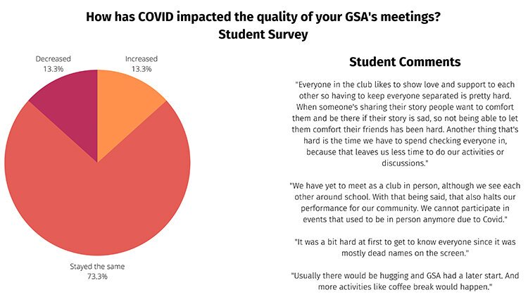 For those GSAs meeting in person, social distancing requirements and assigned seats mean students aren’t able to move around to hug or sit near their friends, and students shared that these distanced settings can make the meetings feel lonely or clinical.