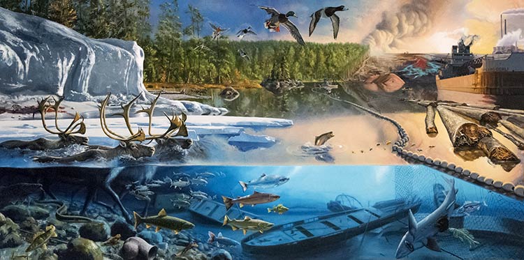 At the heart of Alexis Rockman: The Great Lakes Cycle—currently on exhibition at Cleveland’s Museum of Contemporary Art (MOCA)—are five mural-sized paintings depicting the Great Lakes’ ecological history, evolution, and challenges.