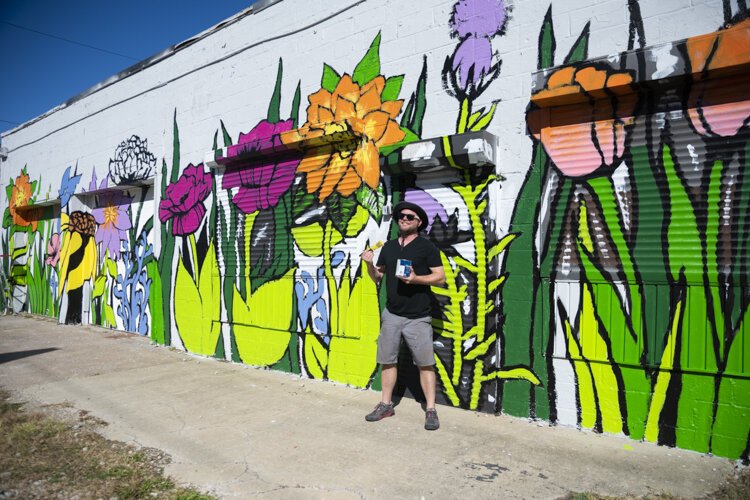 This past week Weider put the finishing touches on the mural that spans a 100-foot wall and rounds the corner for another 30-foot stretch. Instead of being a blemish on the landscape, the building now sprouts a garden of colorful flowers.