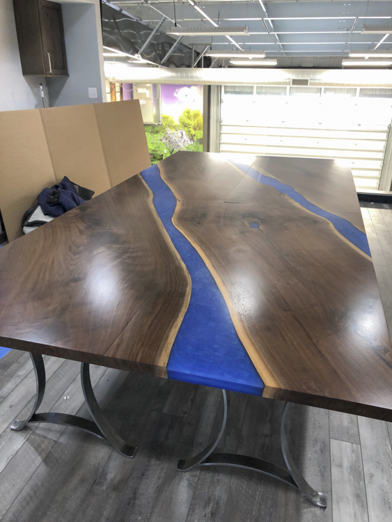 CVCF specializes in rustic furniture—many pieces are made from reclaimed barn wood—and live-edge pieces that incorporate the natural edge of the wood into the look. Many of these pieces also incorporate a waterfall (or riverbed), which is a technique using epoxy resin to create a colorful accent.