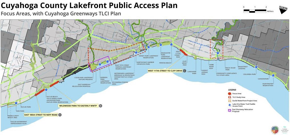 The Lakefront Public Access Plan was announced by Cuyahoga County executive Armond Budish in October 2019 as a way to both improve transportation networks and increase public access to Lake Erie, as well as implement shoreline stabilization efforts.